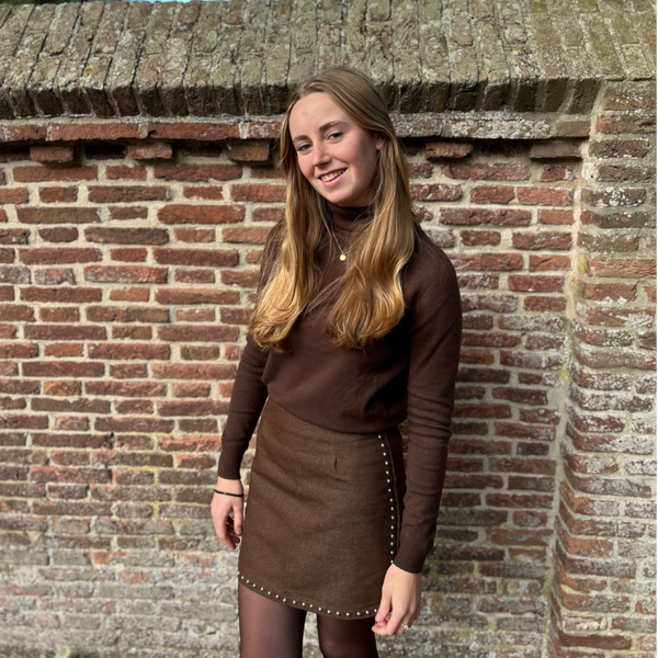 Hele leuke rok bruin met zilveren pareltjes op de voorkant.