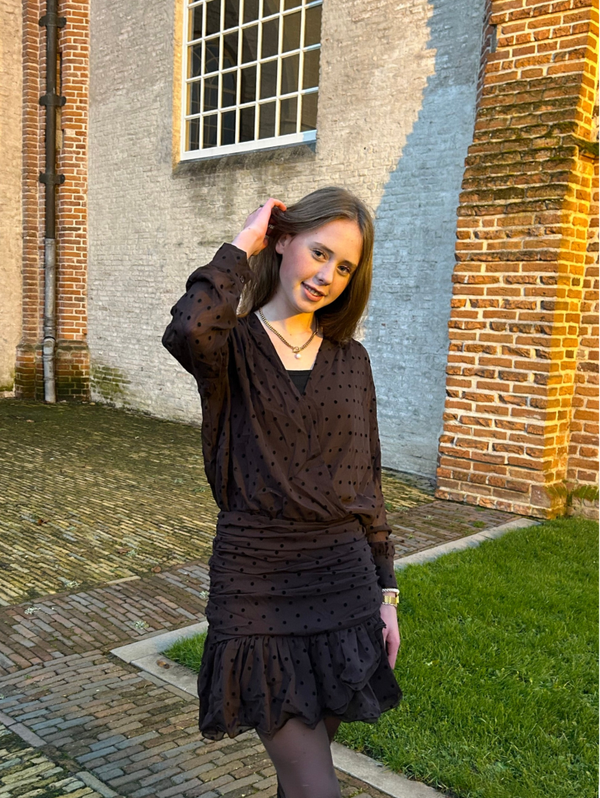 Chocolat jurk met zwarte stippen. hellemaal leuk voor het najaar nu! model draagt maat s De jurk zelf is 100 cm